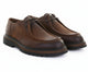 Questo modello è un'interpretazione moderna del classico Derby, caratterizzata dalla cucitura a vaschetta (moc-toe) distintiva e rifinita con una lucidatura manuale che ne esalta la profondità del colore marrone scuro. La linea è pulita, ma il design audace della suola le conferisce una personalità forte, ideale per distinguersi.