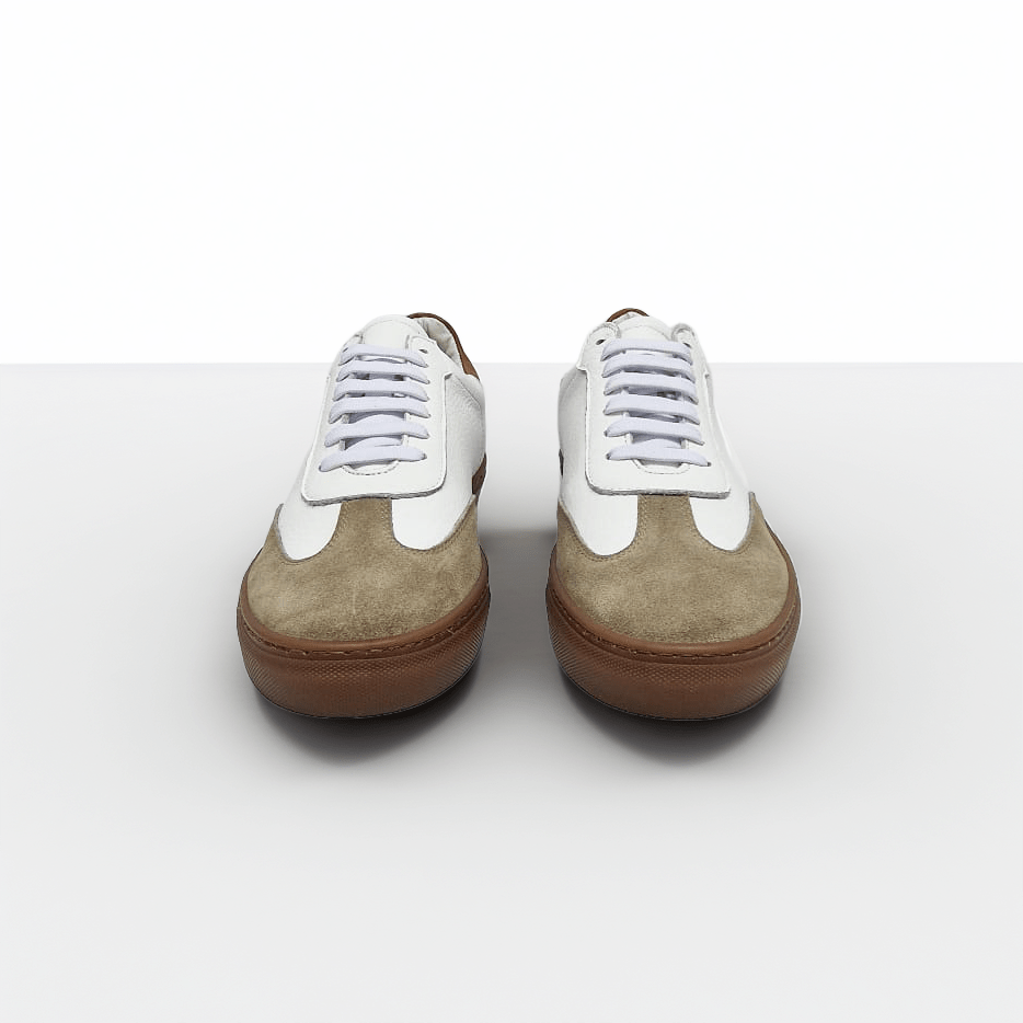 La tomaia presenta un elegante contrasto tra la morbida pelle bianca sulla parte superiore e il raffinato suede grigio sulla punta e sui lati. Questo design bicolore aggiunge un tocco di originalità e dinamicità alla scarpa. Il dettaglio color cuoio sul tallone riprende la tonalità della suola, creando un equilibrio cromatico naturale e sofisticato. La chiusura con lacci tono su tono assicura una calzata confortevole e personalizzata.
